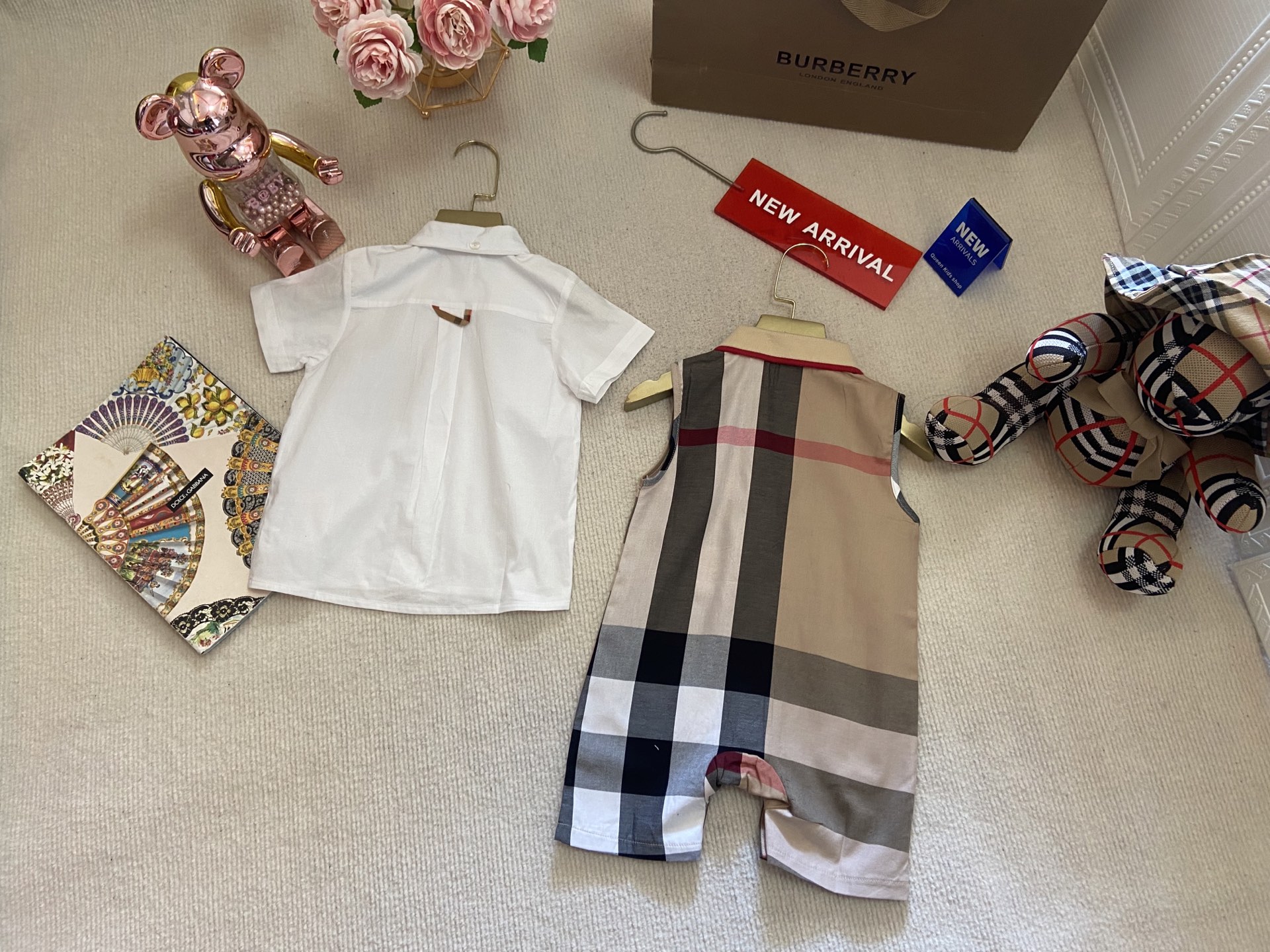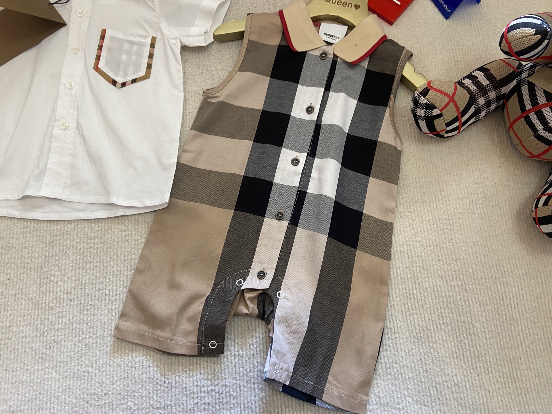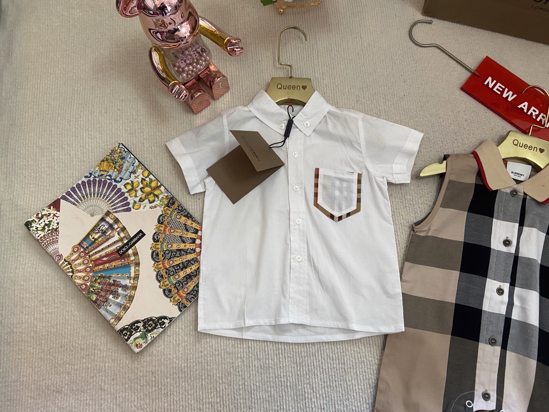 Book for one week! Burberry, a high-end children's wear set for boys and girls, is a two-piece set: a checked shirt and a vest jumpsuit. Made of pure cotton woven fabric, it is comfortable and good-looking to wear. Size: 59-66-73-80-90cm