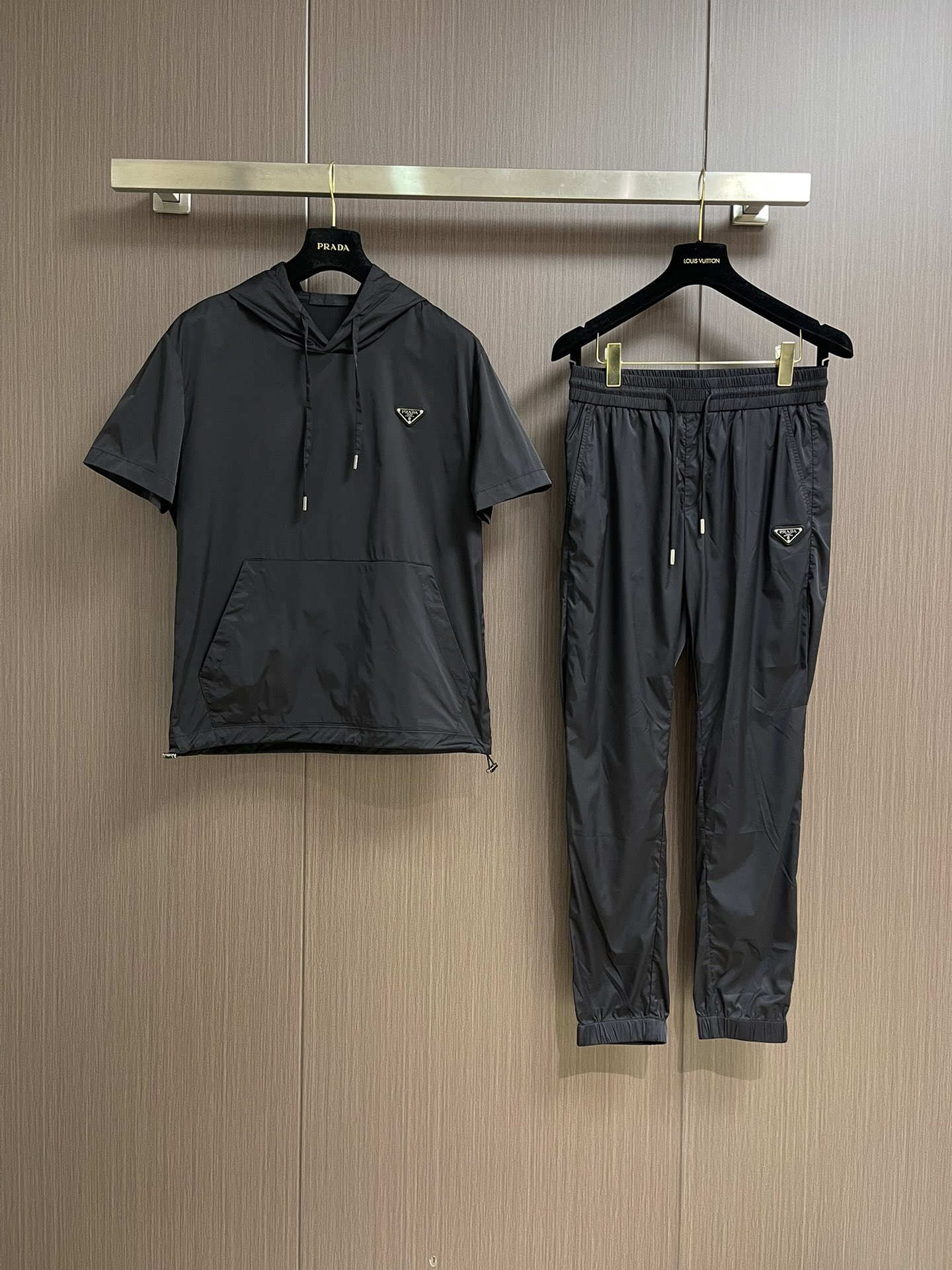 This complete Prada Spring/summer hooded short-sleeved T-shirt and long pants set features exquisite craftsmanship fabric and classic short-sleeved hooded design. It is unparalleled in both wearing comfort and can be said to be a must-have for everyone in summer. Size: 48-56