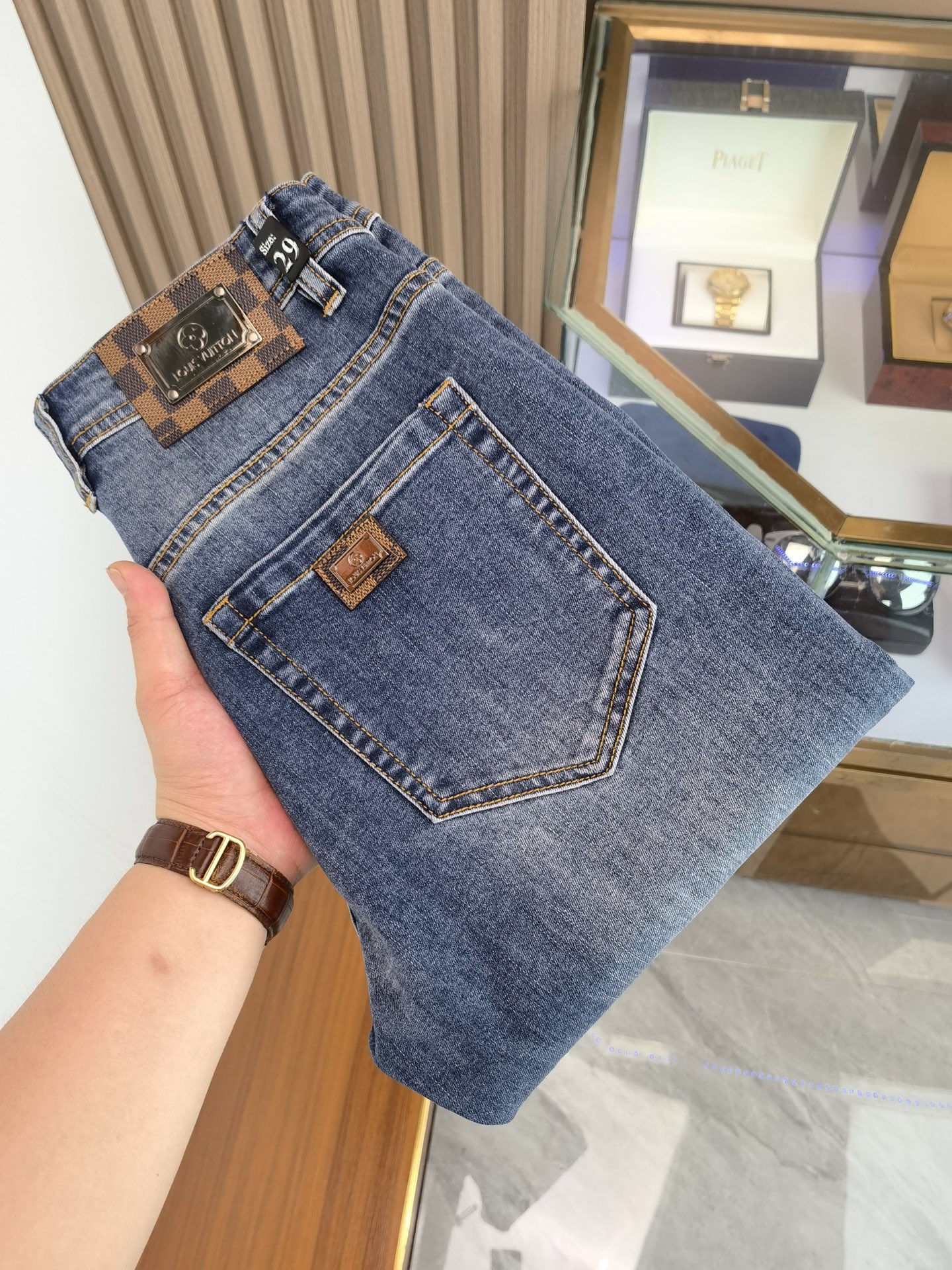 LV men's denim jeans, officially announced album poster outfit style! This high-end imported denim fabric is specially selected from the pure 13oz ounce denim fabric of Okayama, Japan. It features an eco-friendly plant enzyme washing process. The texture has a light retro color, which is very beautiful and perfectly suits the color matching of autumn and winter. After washing, the fabric is soft and fine, but has a strong sense of elasticity and a slight elasticity, providing an excellent comfortable experience. There is no damage from any craftsmanship elements throughout, preserving the purest natural color of the tannin! All the details are perfect, exquisite and meticulous. The latest waist leather label highlights the brand's characteristics. The hardware accessories, leather labels and wiring all demonstrate the craftsmanship! The cut is perfect, with an excellent effect of lifting the buttocks and shaping the body. It can easily be paired with any top in the wardrobe, has wide compatibility, and meets the needs of various daily outfits. The upper body style is very stylish. It is a must-have pants for quality control and 1V enthusiasts! Size: 28-38, no 35 or 37