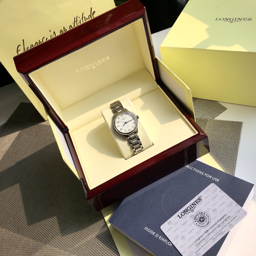The Longines Master Collection, a century-old classic in stock, presents a simple and elegant quality on the wearer's wrist. It features a highly sporty stainless steel case and an anti-wear synthetic sapphire crystal. The women's model has a diameter of 25.5 millimeters. It is decorated with elegant black Roman numeral hour markers, which echo the simple and beautiful central blue steel three-hand, making the time presentation clear and intuitive. The movement adopts the EAT2892 engraving Chronometer highest grade (blue pin) automatic winding mechanical movement, with a vibration rate of 28.800 times per hour, providing a power reserve of 40 hours. It features a 316 stainless steel case, a three-fold safety clasp and a push-button opening mechanism. It comes in a packaging box with the code 821008230