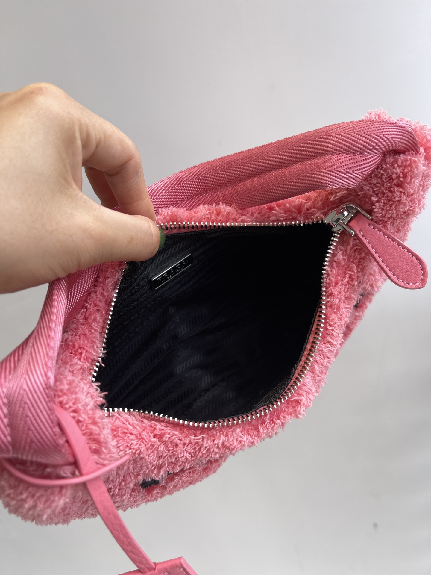 Prada 21s women's new 2000 wool loop fabric underarm single-shoulder bag. The bag body is made of soft loop fabric material. The touch is so good. It's fluffy and the soft and sticky texture is super comfortable. The brand's letter Logo is embroidered and engraved on the front, showcasing the brand's signature elements. The side is coated with an enamel metal triangular logo. The zipper opening and closing design features a Prada logo fabric lining inside. It has sufficient capacity and is lightweight and portable. The nylon webbing handle looks great when carried under the armpit or by hand. It's a great choice for commuting, going out, or even for daily dates and shopping. It's both fashionable and good-looking when going out. Recently, some of Prada's new models have perfectly interpreted the sweet and cool style, which is simply amazing. They are the new favorite of fashionista and another bestseller recommended by Internet celebrities. They are super versatile and good-looking. Fashionista must buy them. Size: 22X12X6cm nNumber: #63738950