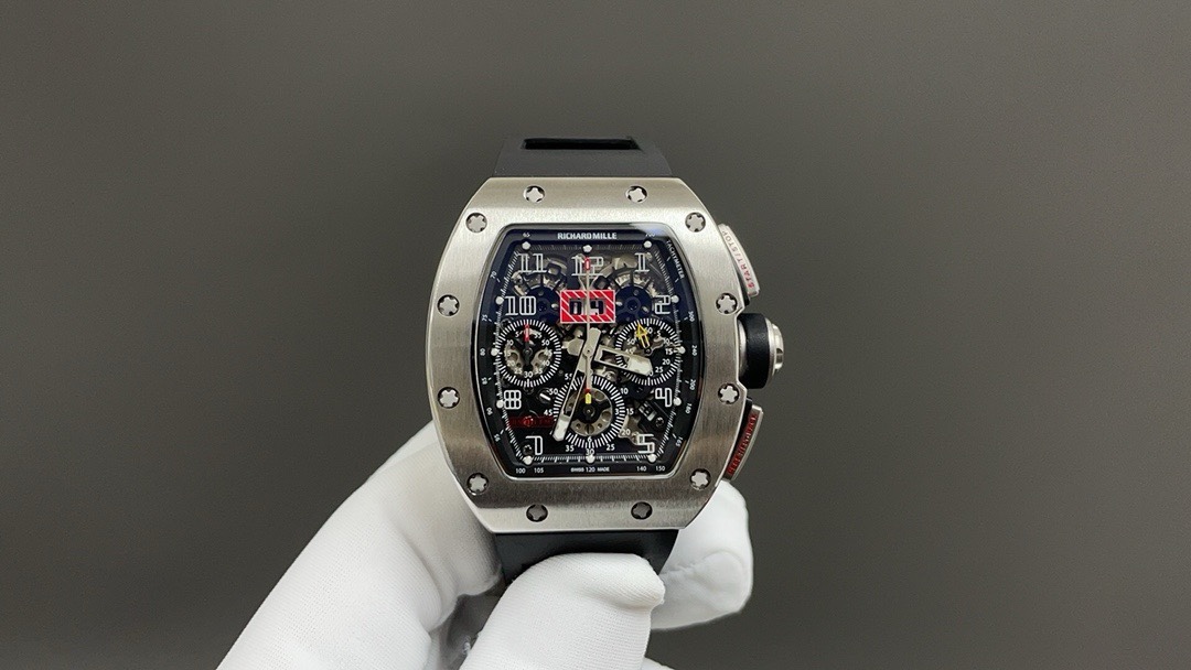???? [RICHARD MILLE] RM011-FM collection, made of stainless steel, perfectly fits the ergonomic design of the brand 's iconic buildings that pursue perfection. Every component of RM 011 is an aesthetic expression of its function. The RM011-FM watch retains the most recognizable signature shape, but the craftsmanship it employs still far exceeds that of the past. For the case part, the titanium version shown in the picture is available, but there are also rose gold and titanium versions to choose from. However, no matter which one it is, they both have a finely crafted brushed surface, which, when paired with polished chamfers, presents a sharp contrast. Equipped with the 7750 chronograph mechanical movement and clearly marked functional fonts (Start/Stop and Reset/ Flyback), its design inspiration comes from the pedals in F1 racing cars. All these optimization changes have made this RM 11-FM flyback chronograph automatic wristwatch more sporty and trendy than previous models