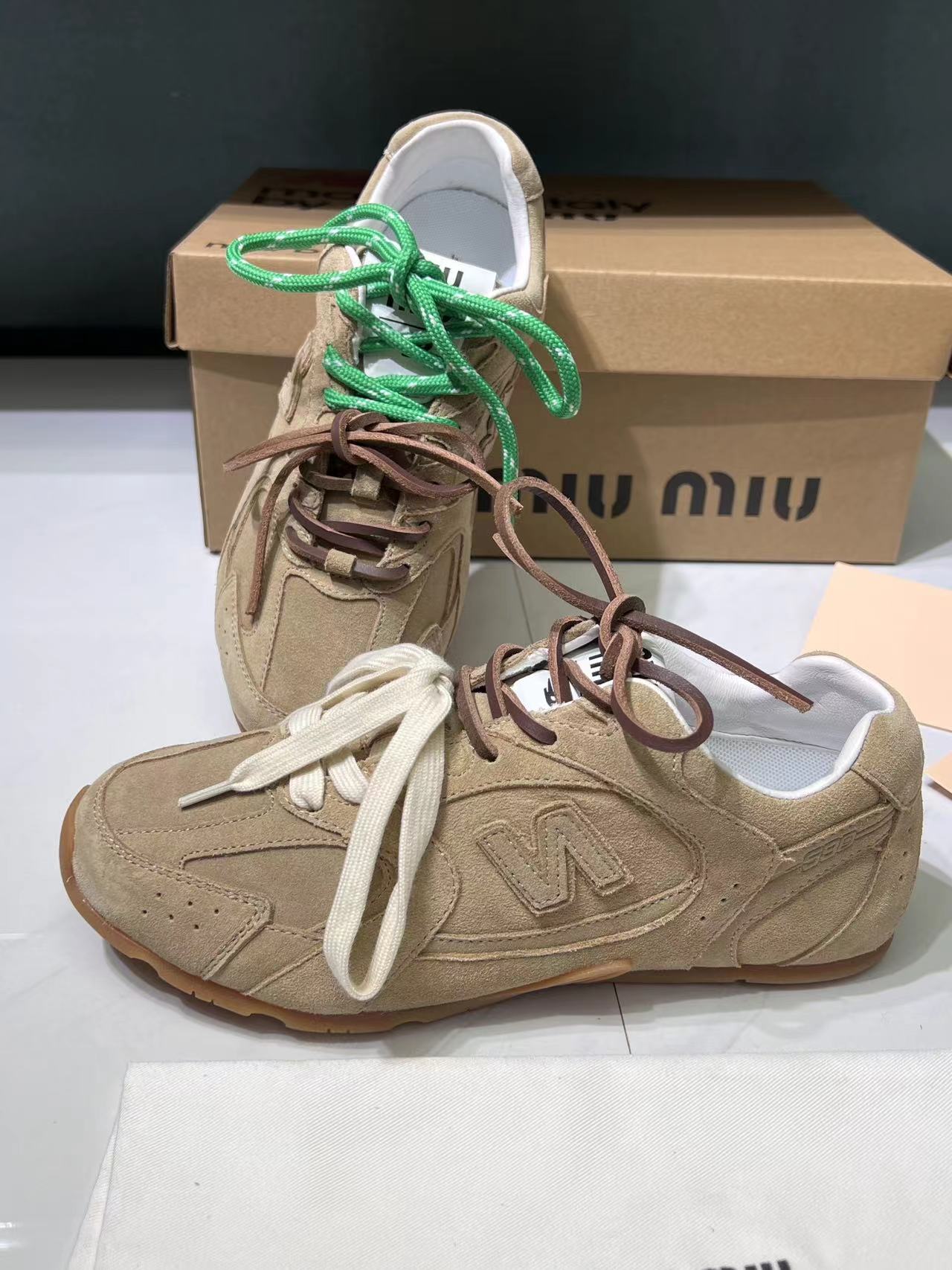 ???? Miumiu x New Balance collaboration NB sneakers for women After the Miu Miu Miu fashion show revealed this pair of sports sneakers in collaboration with New Balance, they were launched on major global purchasing websites. The Maillard colorway of Flat shoes that was exposed at the 2024 runway shows and has been very popular, features a pair of LACES and a unique style, with a very high-quality feel! It's very light and versatile to wear! Fabric: Original custom-made cow fleece Inside: Imported perforated mesh fabric pieced together with sheepskin lining Sole: Original molded cowhide outsole Base thickness: 2.5CM Size: Women 35-40, Men 40-45