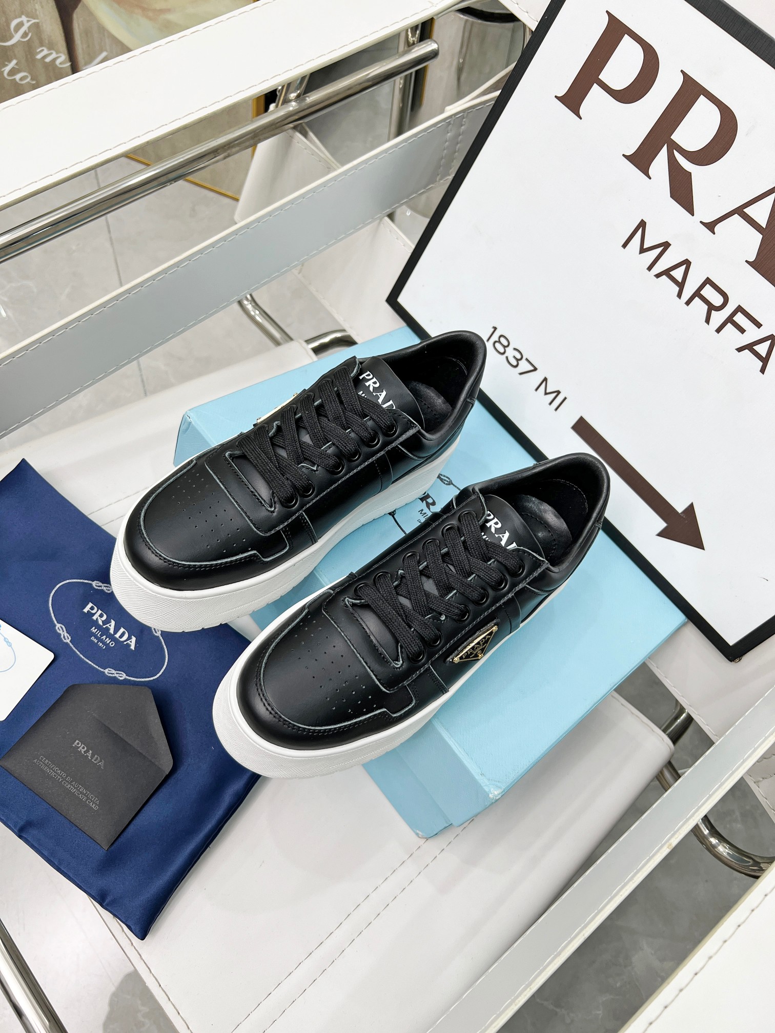 ???? Prada Prada "Panda color" thick soles white sneakers Casual sneakers This sneaker continues the timeless silhouette and elevates the style with a light design, featuring a triangular buckle logo and a 5CM thick sole Suitable for all seasons, it can be paired with various casual looks. In an era when all kinds of styles are eye-catching, the white sneakers are the ones that can last the longest and gradually capture people's hearts. Leather material: Original edge-cut beads + calfskin combination Inside: Inside the sheepskin Shoe label: Enamel-coated triangular metal logo Size :34-41